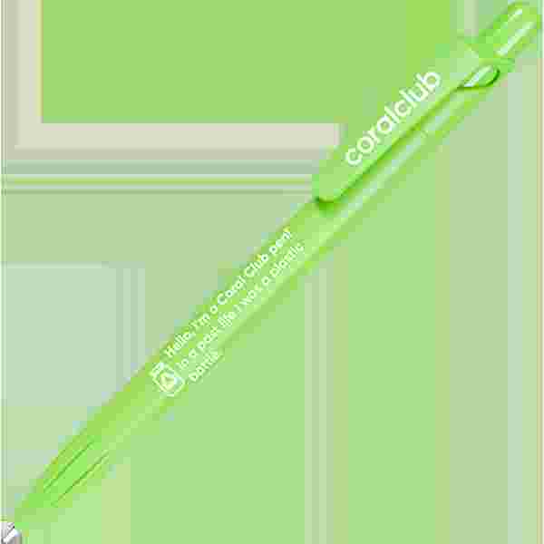Lodīšu pildspalva ar spiedpogas mehānismu, kas ir izgatavota no PET-RECYCLED materiāla ar uzrakstu "Labdien, es esmu Coral Club pildspalva! Iepriekšējā dzīvē es biju plastmasas bundža".